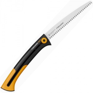 Fiskars Xtract Garden Saw (L) SW75 is a highly efficient tree saw designed to cut fresh wood. This is the largest of the Xtract saws and has a blade length of 255 mm with a large sawing capacity up to 120mm. The design features a handy belt clip which retracts when in use while the SoftGrip™ handle ensures a safe grip. There is also a finger guard which protects fingers from sliding to the blade part during sawing. Its highly sharp blade cuts on the pull stroke.