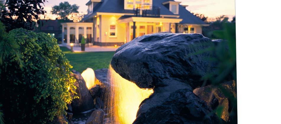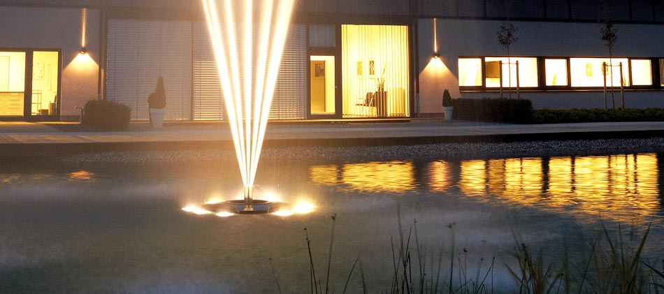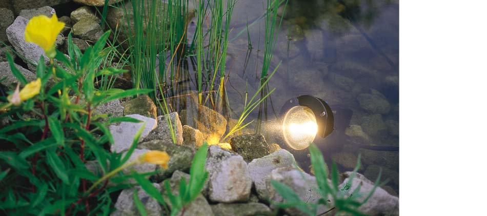 The LunAqua 10 lighting system can be implemented constructively underwater as well as above water. There is no difference whether the lighting system is used in the home garden pond, as garden or park lighting or for professional fountain installations. It is considered a system because the compact lights are connected via special connections with the 12 volt safety transformer. Likewise the transformer can also be implemented underwater. This enables the bridging of long distances between the 230 V outlet and the transformer with standard cables.