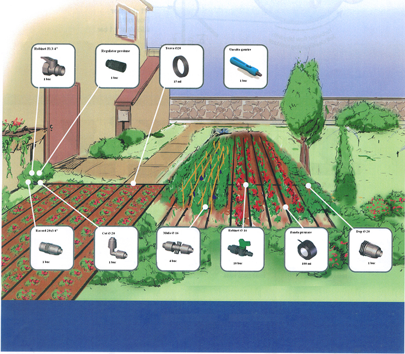Complete Kit drip irrigation which racordeaza directly to the water supply network. May cover 150mp.