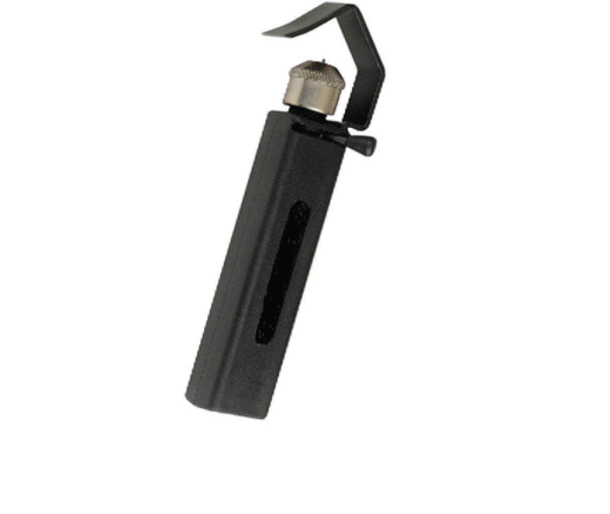The Paige Electric 270004 cable-stripping tool features a spring-loaded cable support arm with a beveled leading edge that assists with insulation and outer jacket removal. The blade swivels to facilitate circular, spiral, and longitudinal cuts.