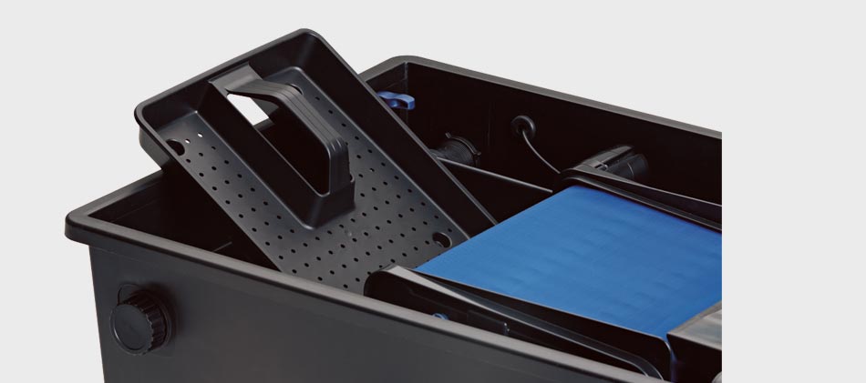 - Durabilitate mare datorita eliminarii reziduurilor mari prin sita automata ScreenMatic inca in faza timpurie, astfel acestea nu ajung in buretii de filtrare