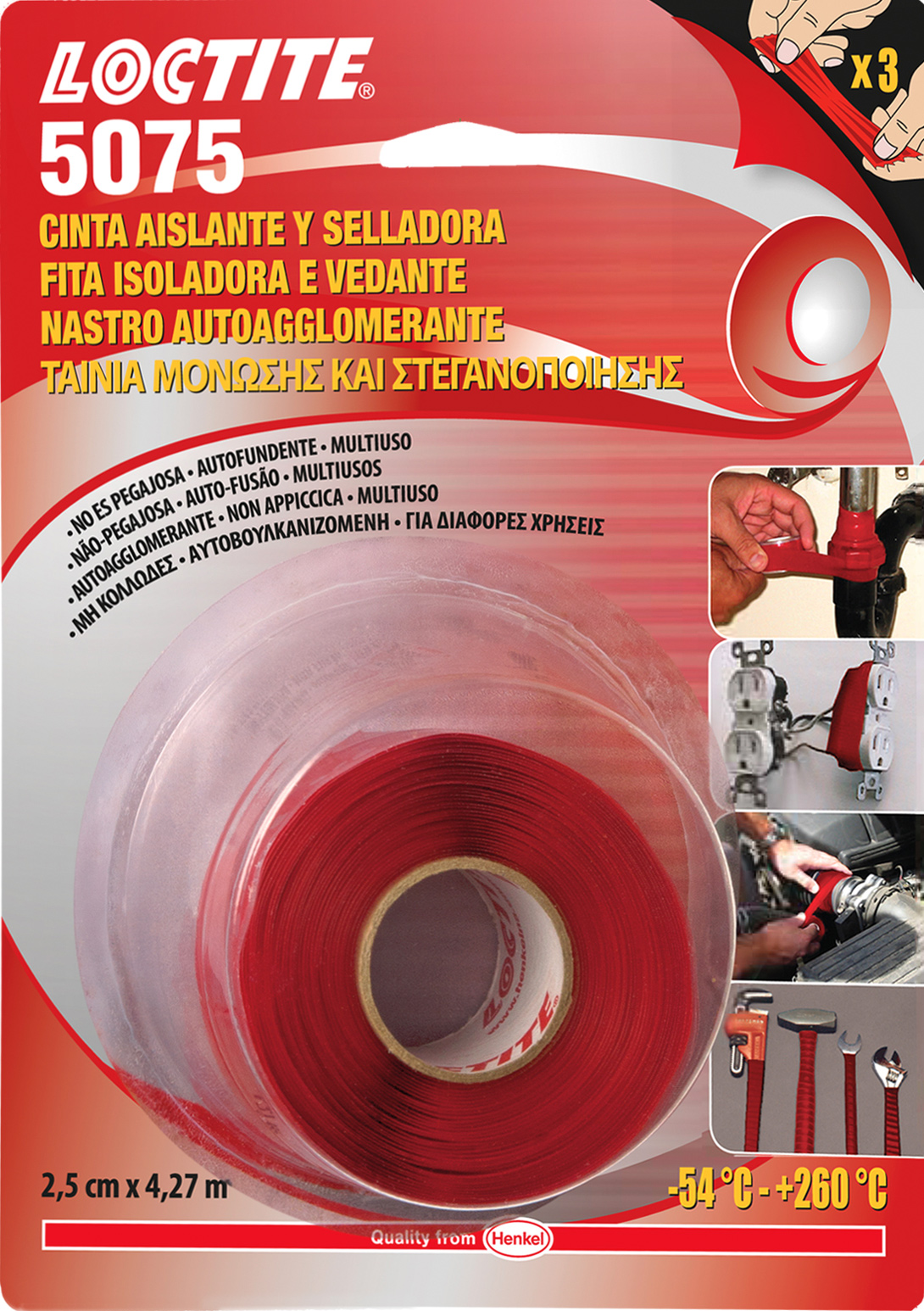 Bandă pentru utilizare în scopuri multiple, nelipicioasă, care aderă la ea însăşi şi care rezistă la condiţii extreme. Această bandă inovativă nu conţine adeziv. Când este întinsă şi înfăşurată în jurul unei suprafeţe, aceasta aderă la ea însăşi, etanşează instant şi protejează zona împotriva pierderilor de aer şi de apă, coroziunii şi zgârieturilor. În plus, marginile sale teşite oferă o grosime uniformă a acoperirii. Atinge puterea maximă în 24 ore.
